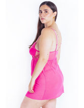 Sexy baby doll in deep pink. It's designed with a full-cup bra adorned with floral lace for support and a touch of sensuality. The bottom of the baby doll is a short, loose skirt made of a soft, lightweight material that drapes delicately over the body, providing comfort and an elegant look. The straps are adjustable, allowing for a custom fit. Overall, this baby doll combines elements of elegance and comfort, making it an ideal garment for both special occasions and everyday wear.