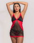 • Transparencias Sutiles: El cuerpo de malla transparente con puntos sutiles y detalles de encaje rojo en los laterales añade un aire de misterio y seducción.