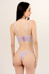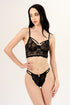 - Braga a Juego: La braga de corte medio está diseñada para complementar el bralette, también en encaje floral, con detalles transparentes que añaden un toque de misterio y sensualidad.