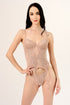 Nuestro corset, adornado con un diseño cautivador en transparencia y encaje, realza tus curvas con gracia y sensualidad. Las copas con varilla proporcionan un soporte perfecto, mientras que la tira en la cintura añade un toque de coquetería irresistible. Además, los ligueros incorporados te permiten completar tu look con medias sensuales para una apariencia aún más seductora. La tanga, con delicadas tiras a los costados, completa este conjunto con un toque de provocación sutil. Vive tus fantasías más ardientes con nuestra colección de lencería, donde el lujo y la sensualidad se fusionan en cada detalle.